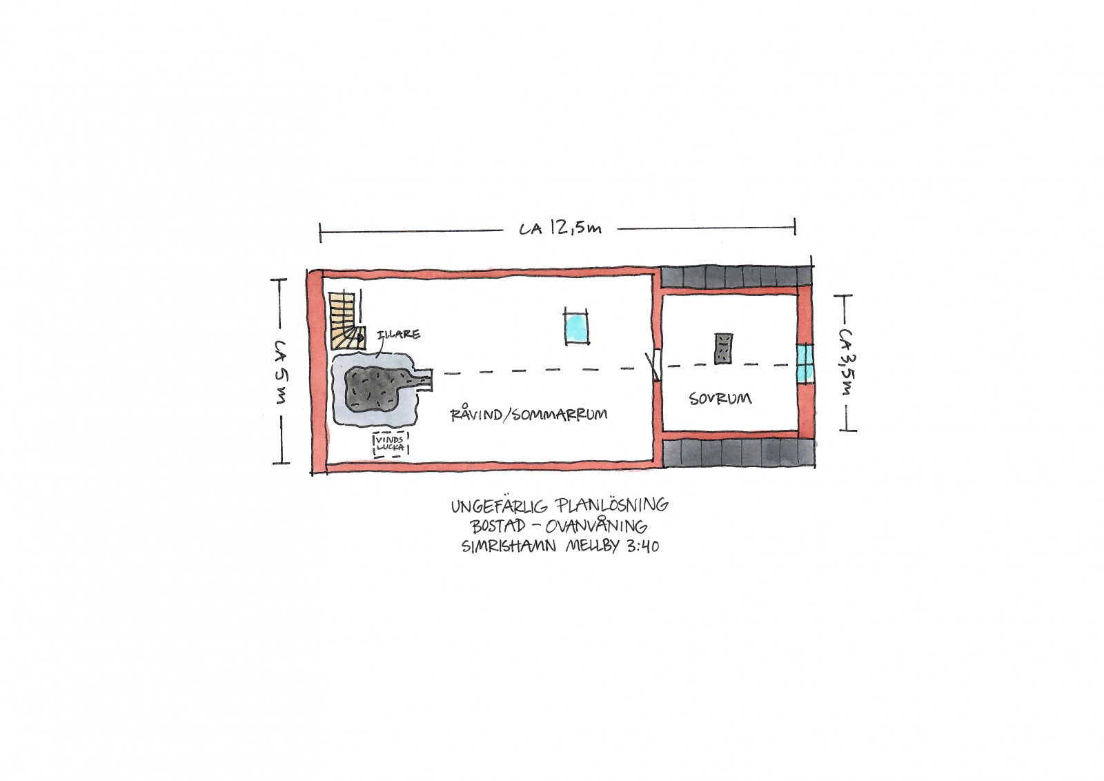 Golv: ca 48 kvm. Tak: vind ca 2,97 m t nock / 1,87 m t bjälke. Sovrum ca 2,65 m / 1,82 m t bjälke.
