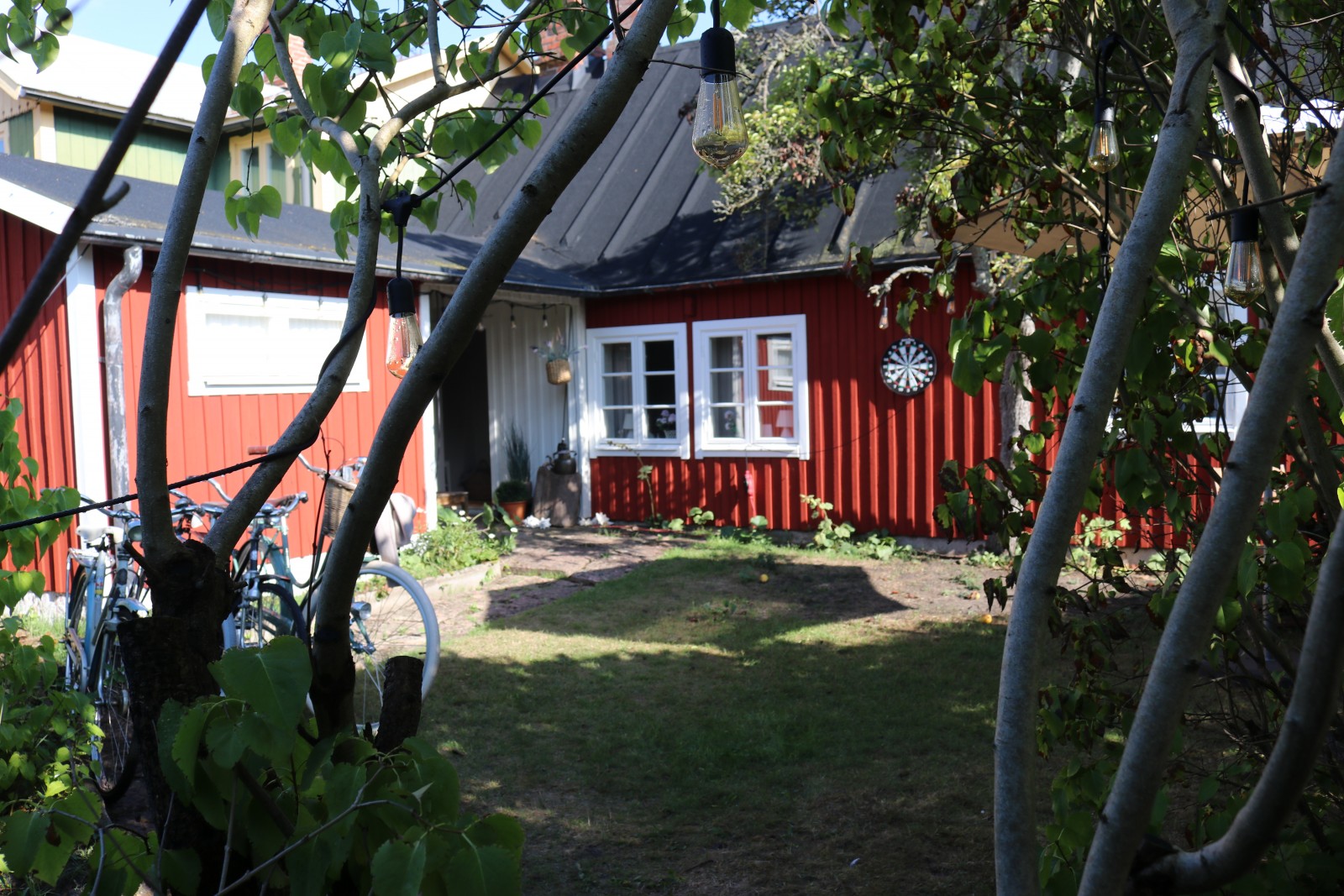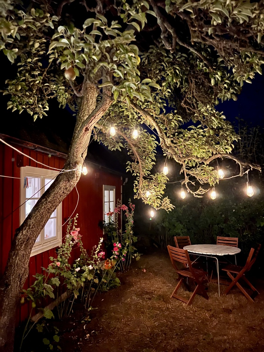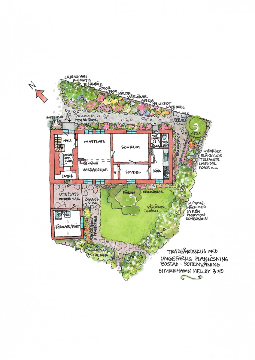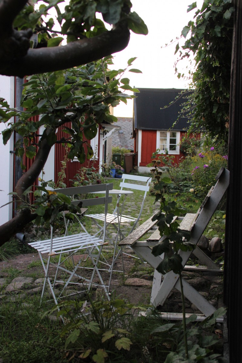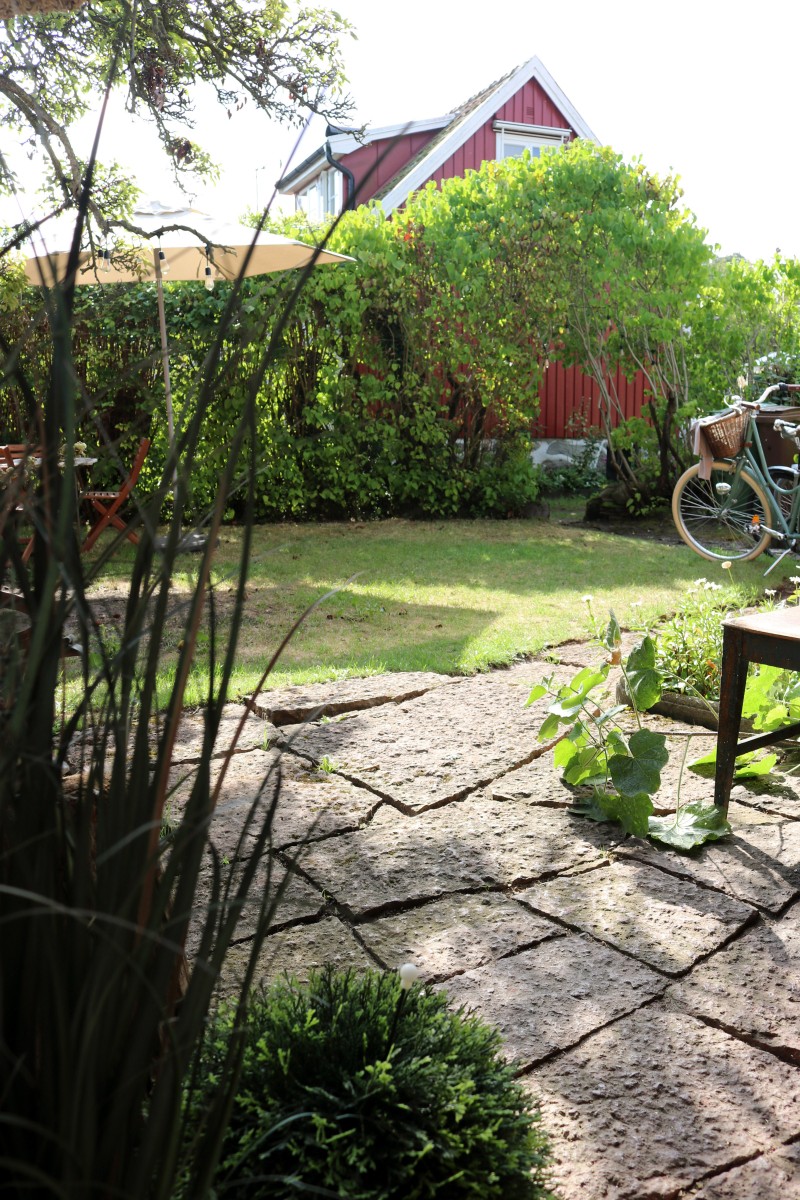 Trädgården har ett stråk av magi över sig, den är inte stor men rymmer ändå flera uteplatser och har ett så skyddat och soligt läge att du kommer att förundras. Säljaren kallar trädgården för ett solhav. Här finns massor av möjligheter men inga måsten.