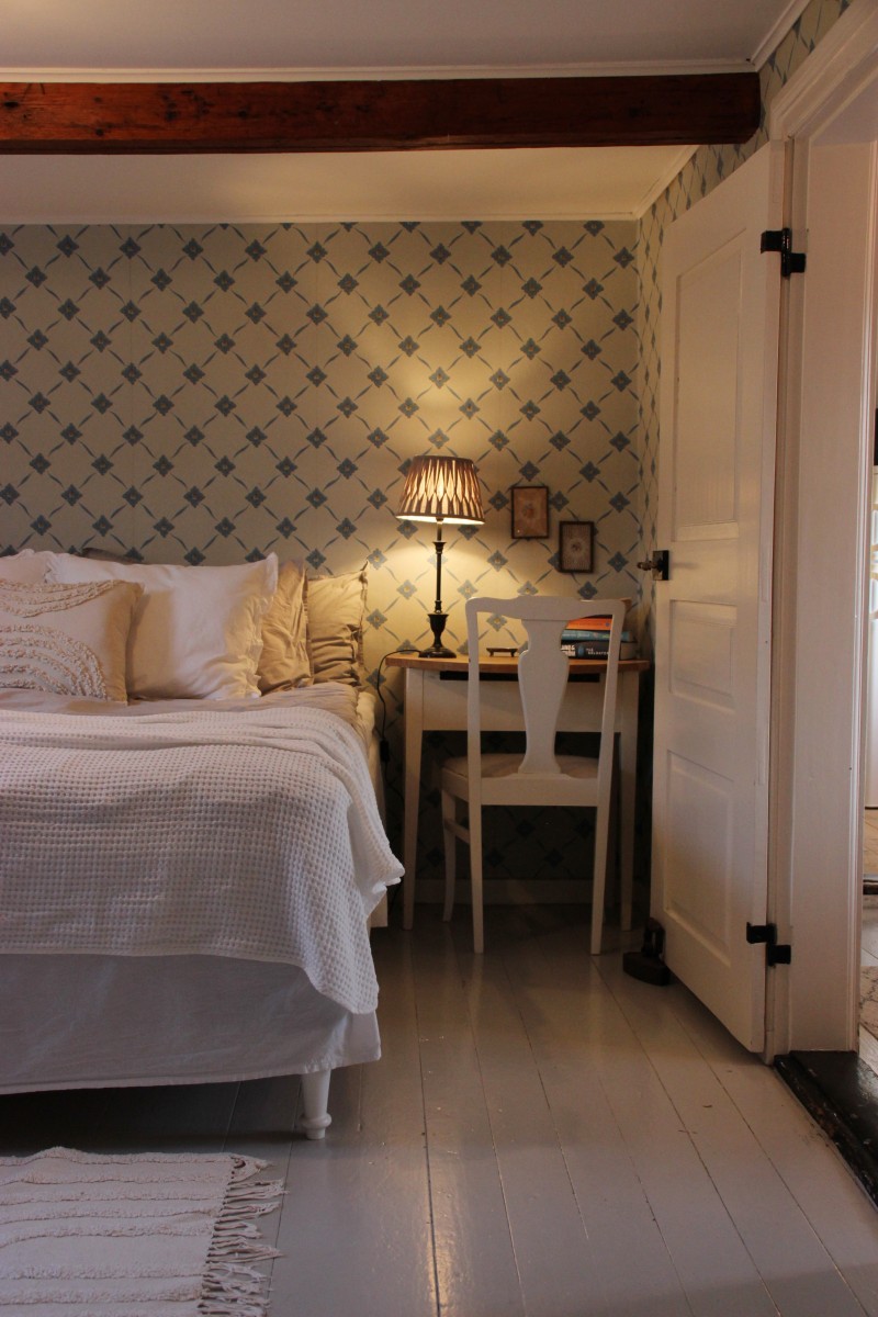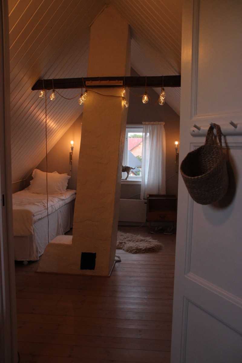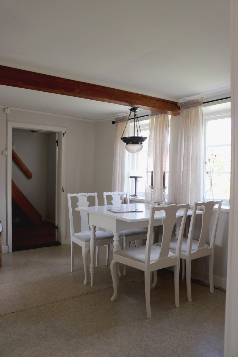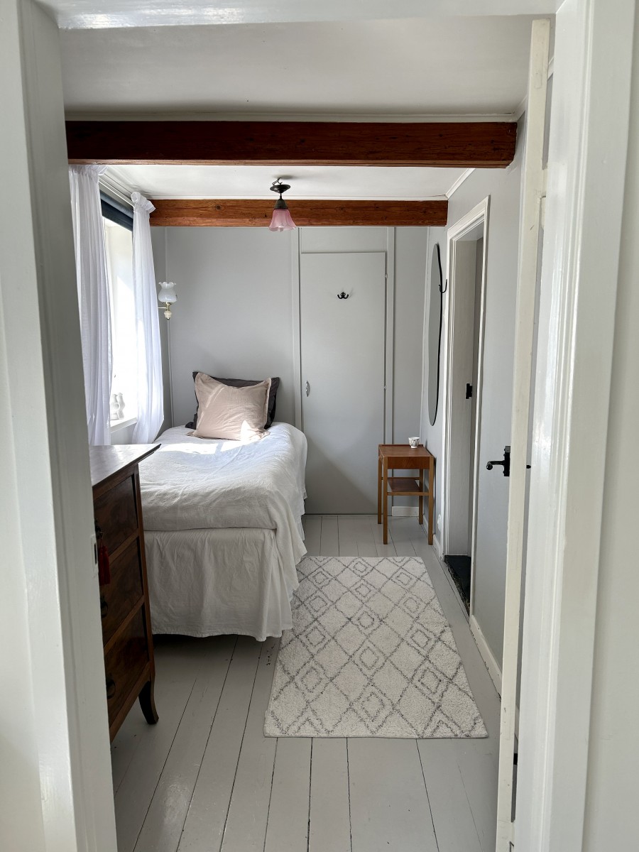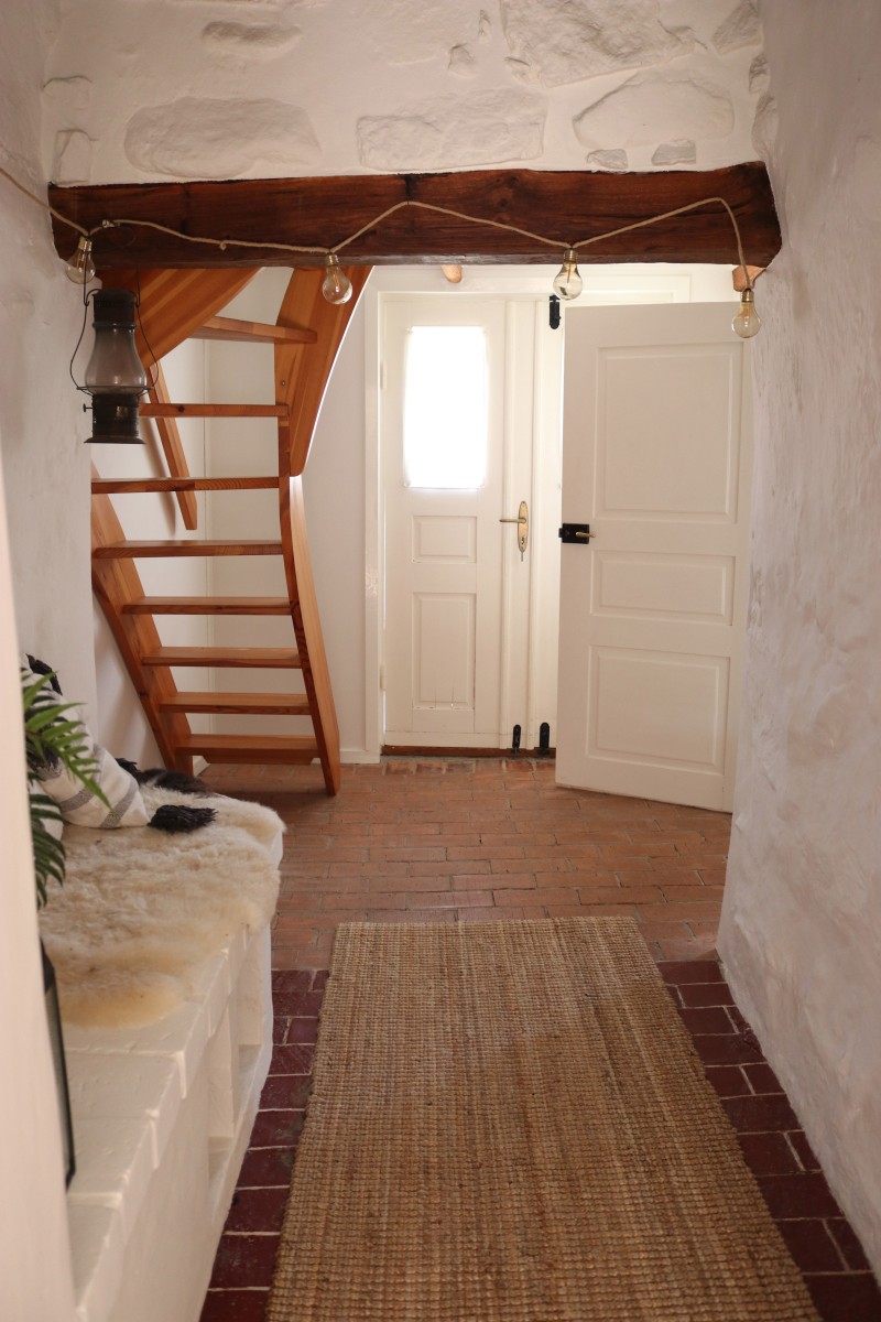 Det lilla huset med anor från 1700-talet är förvån-ansvärt stort och rymmer många sovplatser för både familj och vänner. När du kliver in i hallen möts du av den öppna skorstenen, illaren, som sprider trivsel och en svag doft av tjära. Stenväggarna och det handslagna teglet bär på tidens berättelser. Trägolvet och de synliga takbjälkarna (vissa låga, som sig bör i ett riktigt gammalt hus) ger en hemtrevlig känsla som bara ett hus med ett rikt kulturarv kan förmedla. En trappa upp, under råvindens sticketak kan drömmarna få utrymme att sväva fritt.
