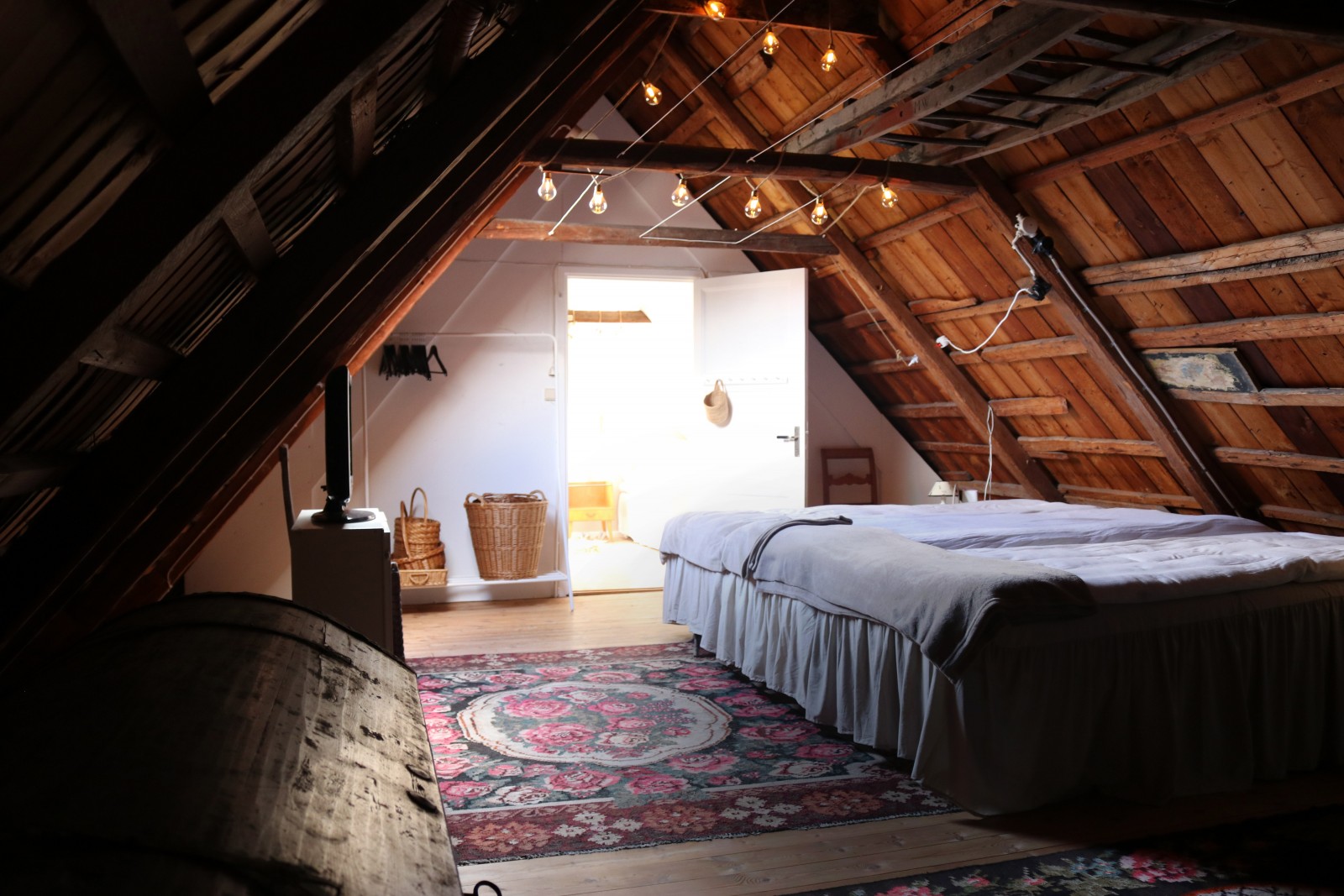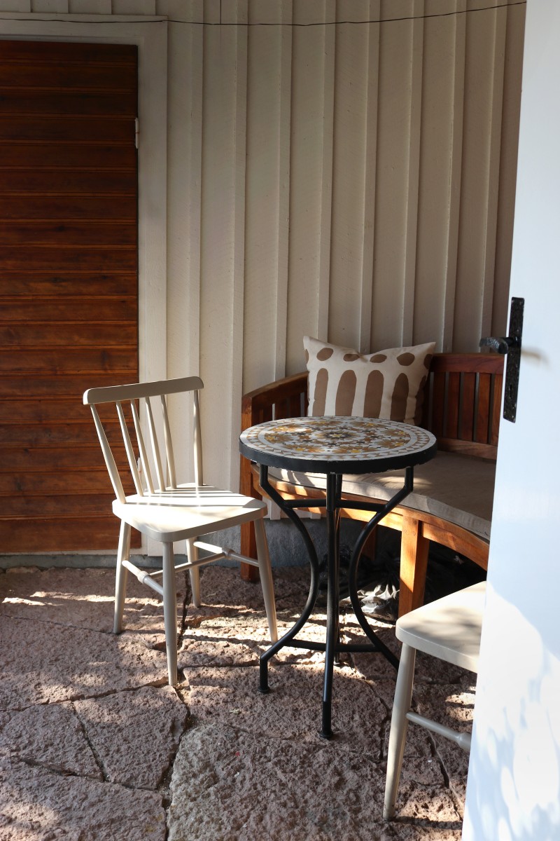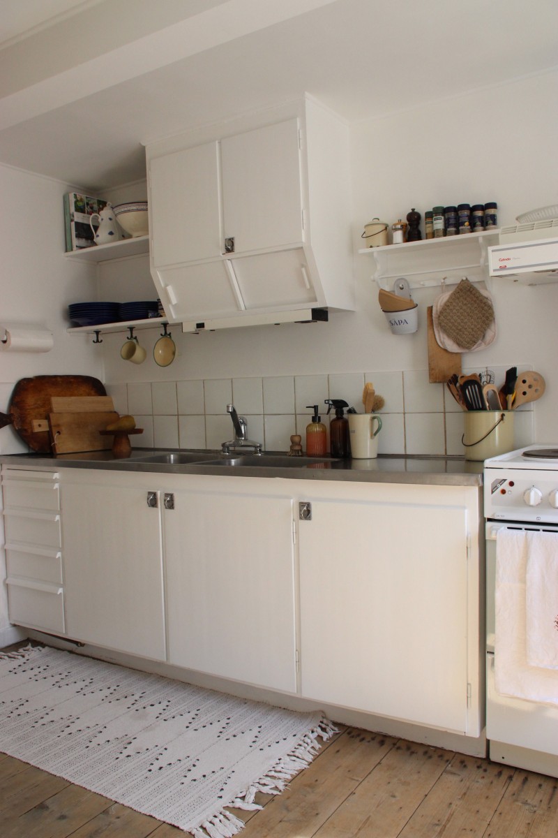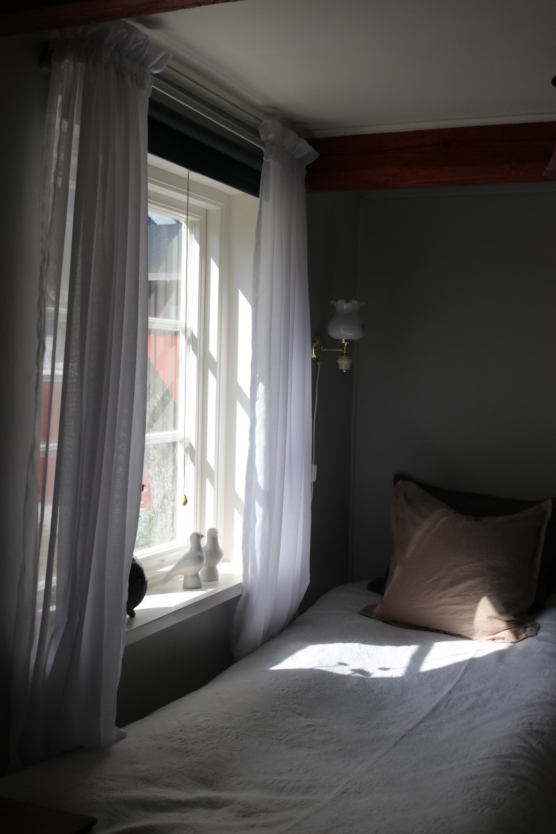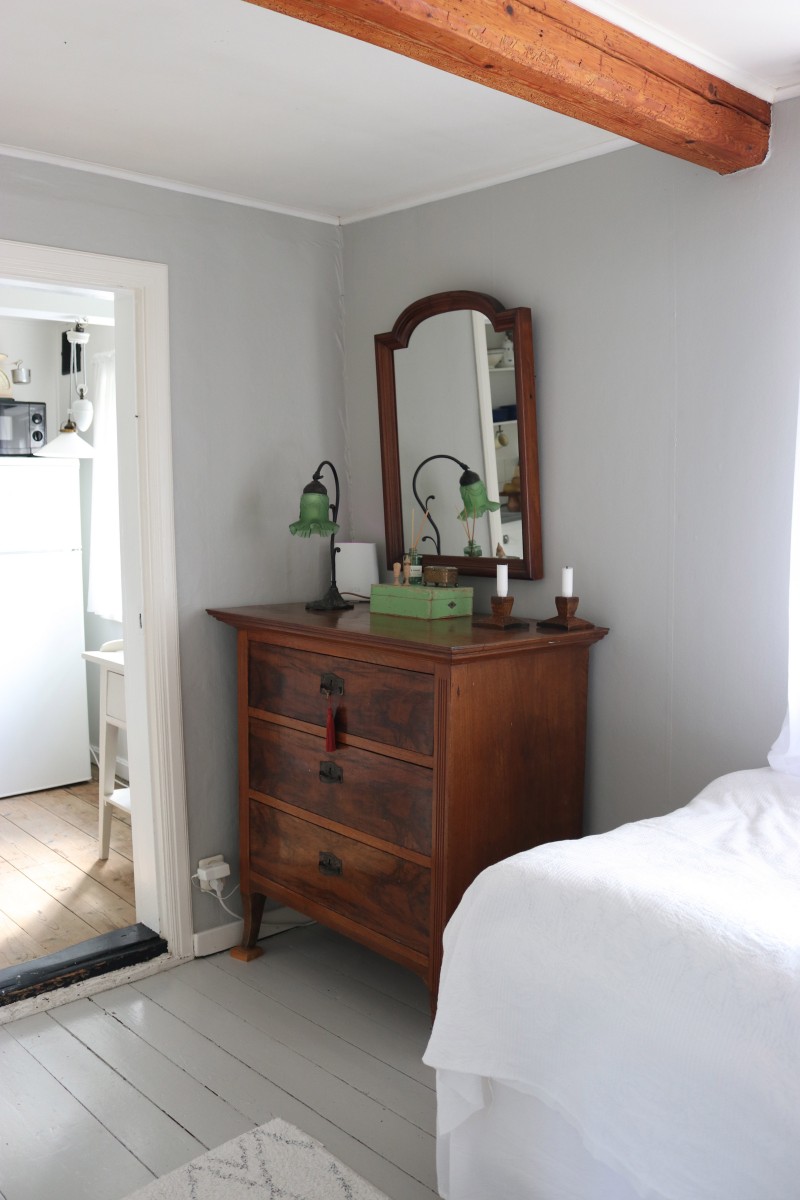 Det lilla huset med anor från 1700-talet är förvån-ansvärt stort och rymmer många sovplatser för både familj och vänner. När du kliver in i hallen möts du av den öppna skorstenen, illaren, som sprider trivsel och en svag doft av tjära. Stenväggarna och det handslagna teglet bär på tidens berättelser. Trägolvet och de synliga takbjälkarna (vissa låga, som sig bör i ett riktigt gammalt hus) ger en hemtrevlig känsla som bara ett hus med ett rikt kulturarv kan förmedla. En trappa upp, under råvindens sticketak kan drömmarna få utrymme att sväva fritt.