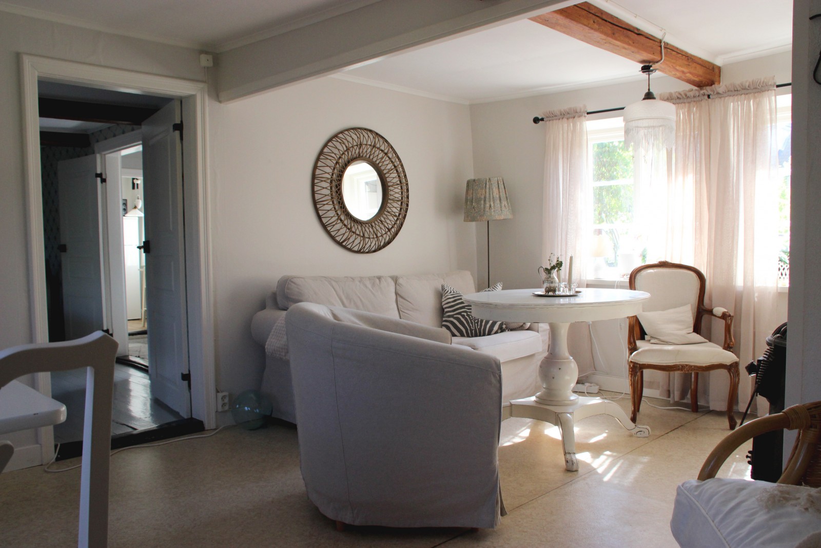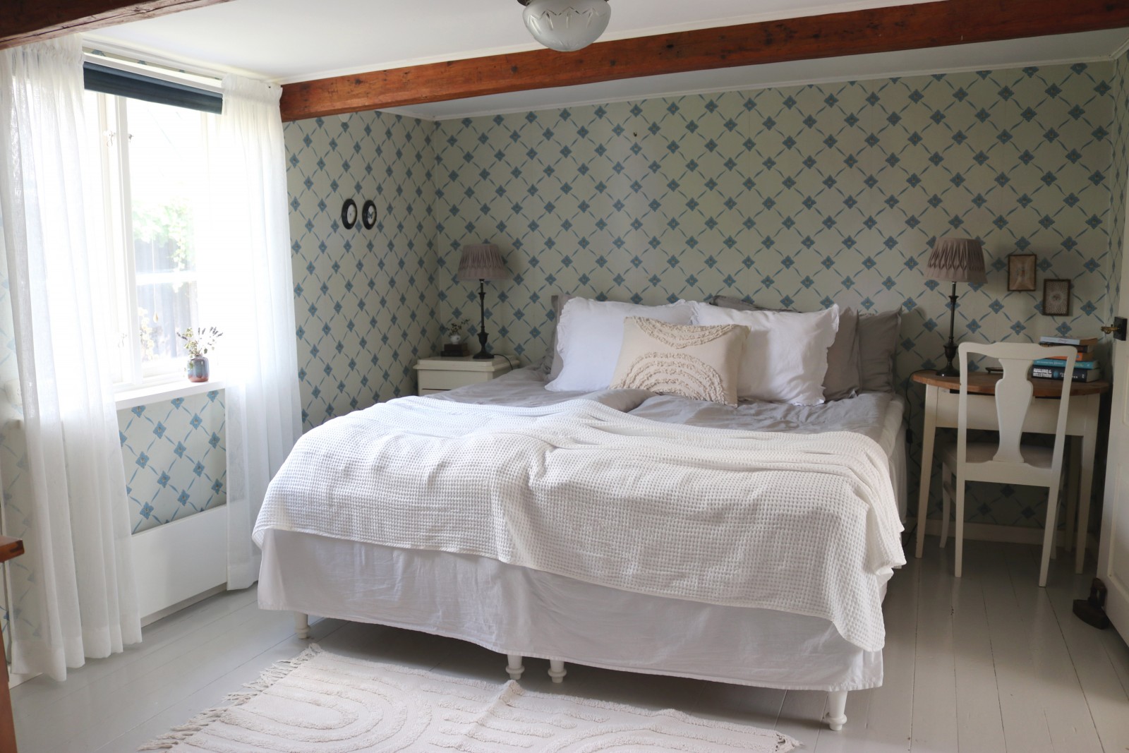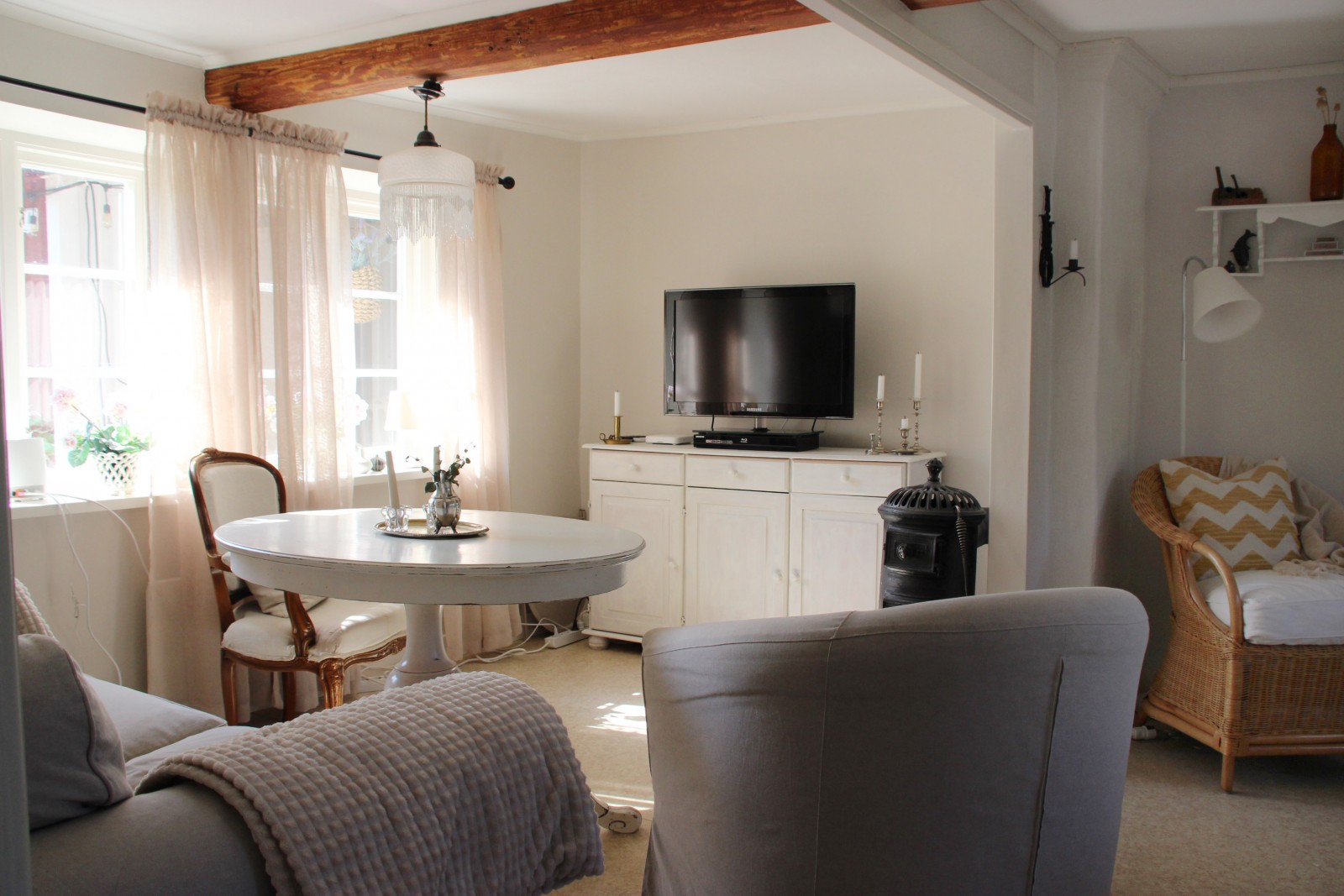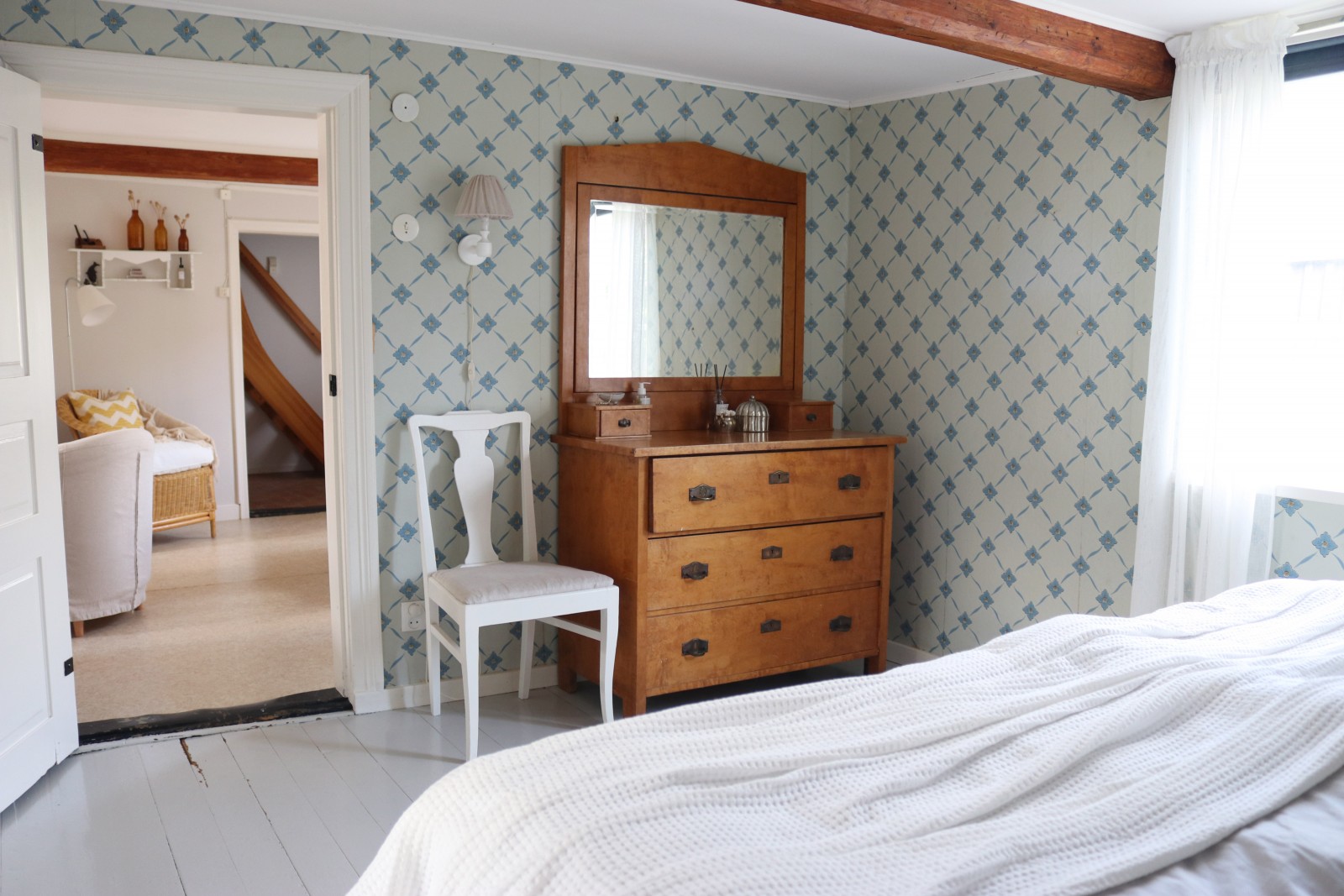 Det lilla huset med anor från 1700-talet är förvån-ansvärt stort och rymmer många sovplatser för både familj och vänner. När du kliver in i hallen möts du av den öppna skorstenen, illaren, som sprider trivsel och en svag doft av tjära. Stenväggarna och det handslagna teglet bär på tidens berättelser. Trägolvet och de synliga takbjälkarna (vissa låga, som sig bör i ett riktigt gammalt hus) ger en hemtrevlig känsla som bara ett hus med ett rikt kulturarv kan förmedla. En trappa upp, under råvindens sticketak kan drömmarna få utrymme att sväva fritt.