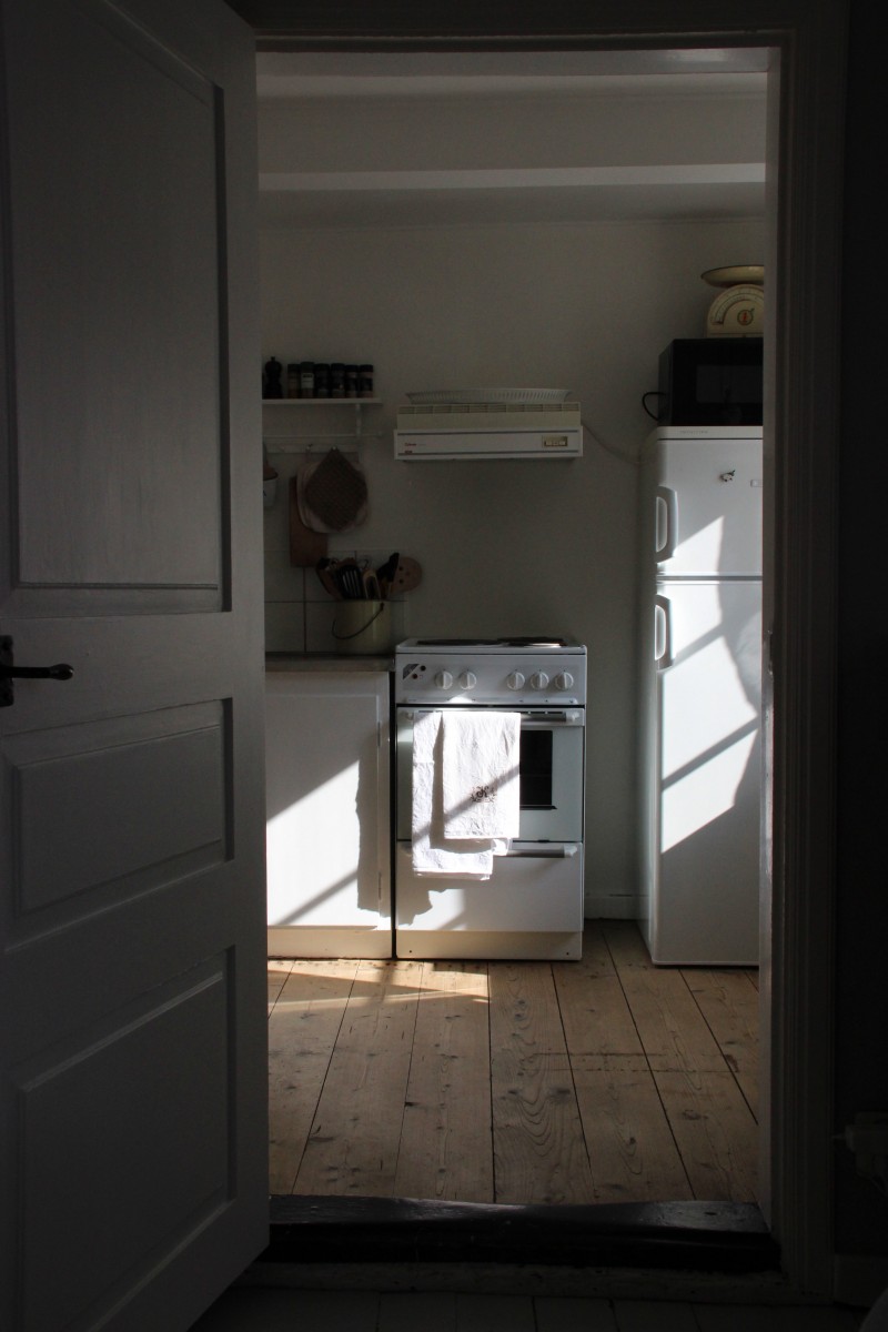 Entrén och den stora hallen med öppen skorsten har golv av tegel. I köksentrén samt lilla och stora sovrummet ligger målade trägolv i ljusgrått. Köket har breda, obehandlade trätiljor. Råvinden har ett smalt, obehandlat trägolv, medan sovrummet på vinden har ett vitsåpat trägolv. I vardagsrum och matsal ligger linoleumgolv ovanpå det ursprungliga trägolvet. I källaren finns en fristående frys. Den har inte använts på länge och funktionen är osäker.