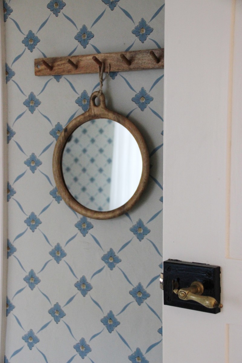 Inredning & utrustning: Dörrar till köksentrén: Gammal trädörr med liggande träpanel och fönster. Vitmålad. Utrustad med kammarlås. Entrén stora hallen: Gammal pardörr i spegelmodell, vitmålad med ovalt dörrtrycke i metall. Huvudentré: Gammal trädörr med liggande träpanel och fönster. Lackat trä. Dörrtrycke i gjutjärn. Samtliga innerdörrar är gamla, vackra spegeldörrar, vitmålade och försedda med kammarlås och stora, grova nycklar. Undantag finns: WC-dörren, skafferidörren och dörren till klädkammare är från 1960-talet och skiljer sig stilmässigt från de övriga. L-formad trätrappa i obehandlad furu som tillkom under 1980-talet, då man öppnade upp i taket för att knyta ihop husets olika våningsplanen. Innan dess nådde man vinden via en taklucka i entrén, som fortfarande finns kvar att beskåda.